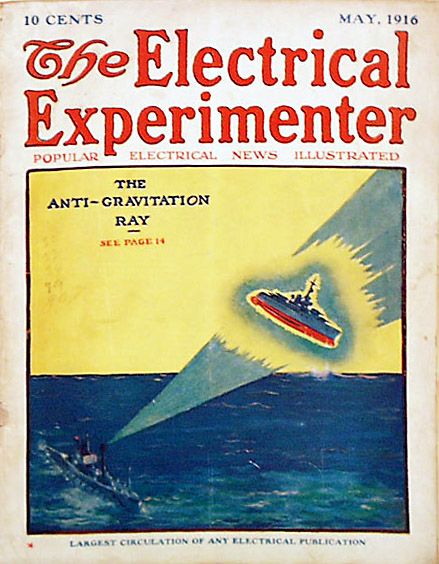 Illustrazione di copertina della rivista Electrical Experimenter (maggio 1916) che presenta un misterioso “raggio antigravità” in grado di sollevare una nave.