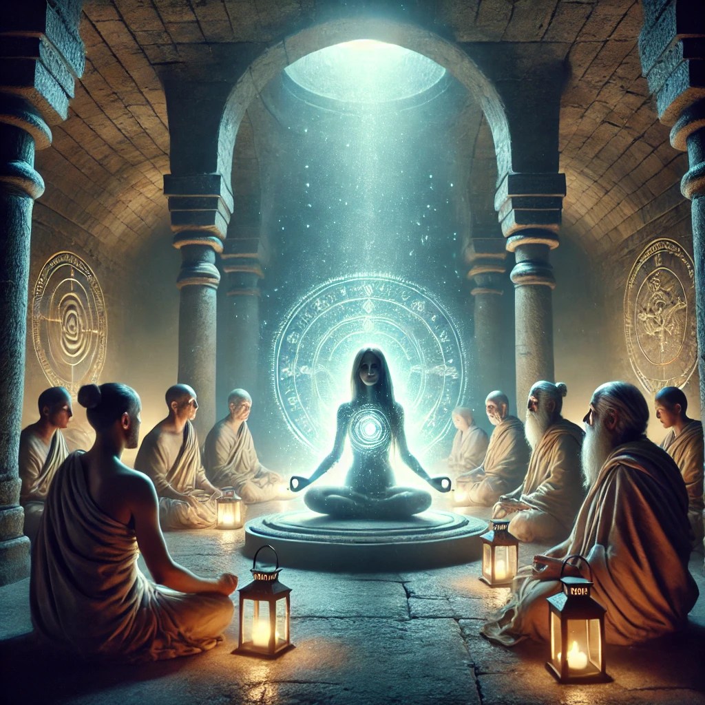The meditation centre and initiation Odysseus takes Nausikaa to an underground temple, where there is a community of wise men devoted to meditation and the study of cosmic laws. Here, the young woman participates in a meditation session led by Ambubhai, a master of Indian origin. During this experience, she feels a strong pressure on her body, a symbol of her entrance into a new state of consciousness.