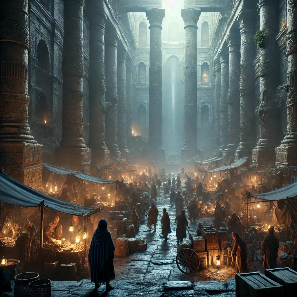 - L’arrivo nella città sotterranea Una volta fuori dal tunnel, Nausikaa giunge in una grande piazza circondata da mura antiche e ciclopiche, che ospita un mercato sotterraneo dove gli abitanti vendono i pochi beni disponibili. Qui nota un uomo misterioso, avvolto in un mantello, che emana un’aura di saggezza e potere.