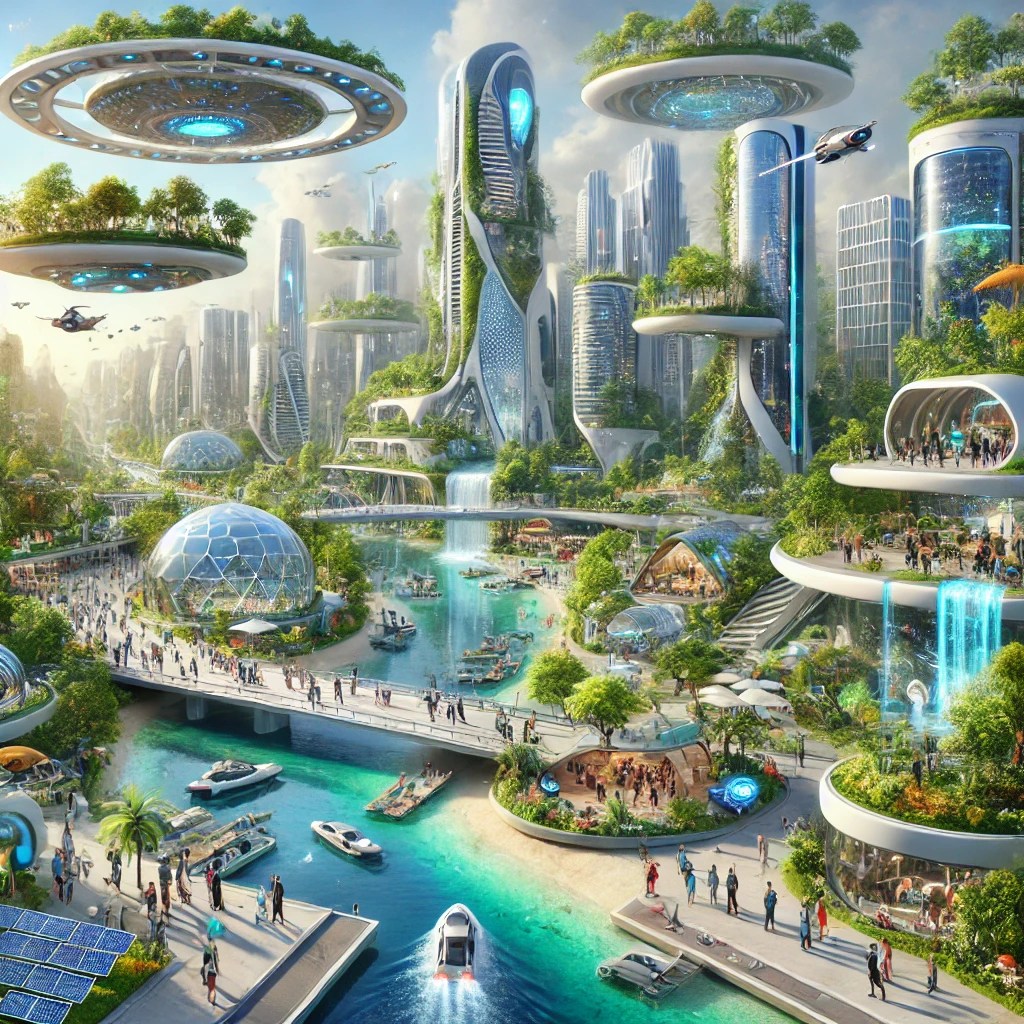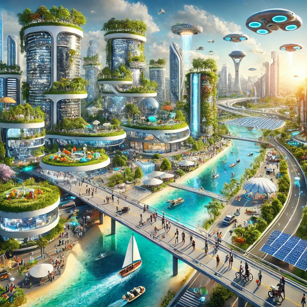 📌 Città intelligenti e verdi → Le metropoli diventano ecosistemi viventi, con edifici autosufficienti, trasporti elettrici e spazi verdi ovunque.