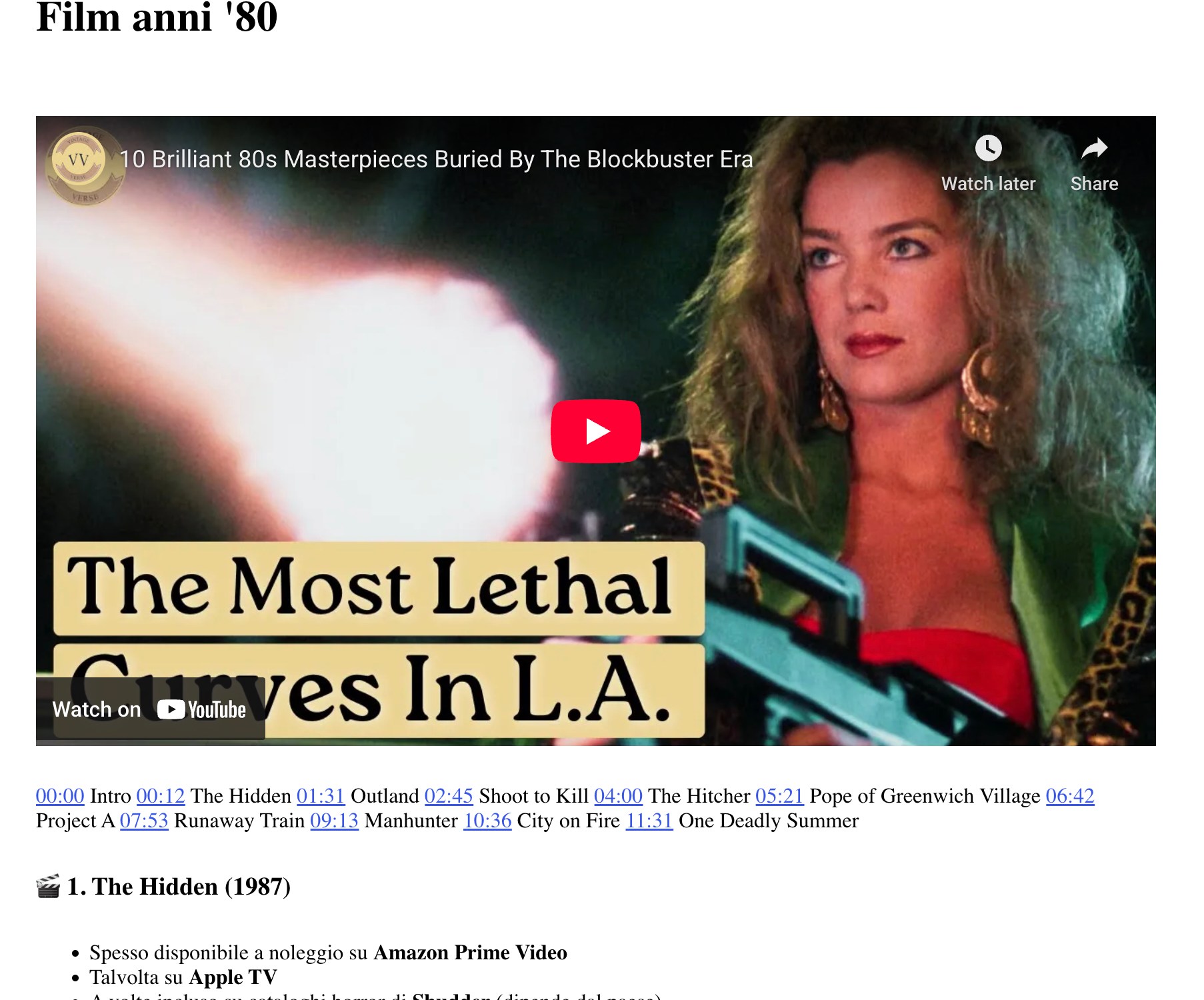 00:00 Intro 00:12 The Hidden 01:31 Outland 02:45 Shoot to Kill 04:00 The Hitcher 05:21 Pope of Greenwich Village 06:42 Project A 07:53 Runaway Train 09:13 Manhunter 10:36 City on Fire 11:31 One Deadly Summer